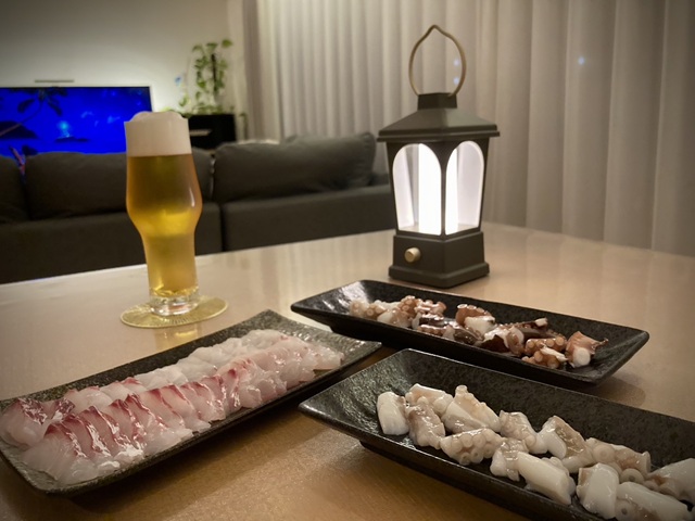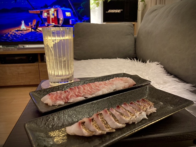 釣り上げたタイは、刺し身と炙り刺しにしました。脂がのっていて甘い。