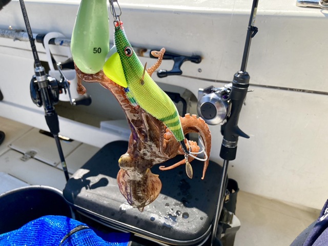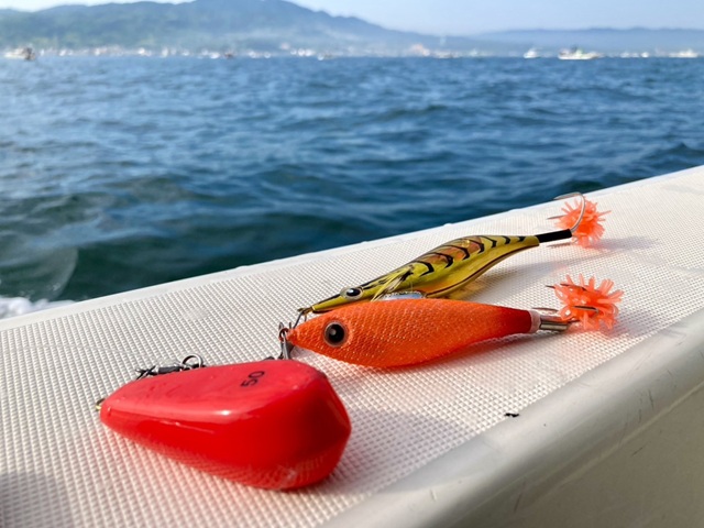 あたりが少なくなると、タコエギやオモリのカラーを変えて誘います。
