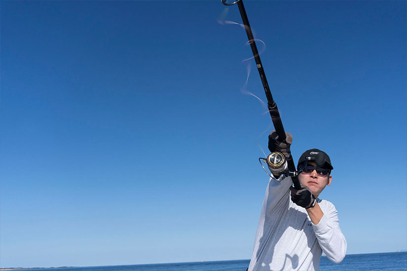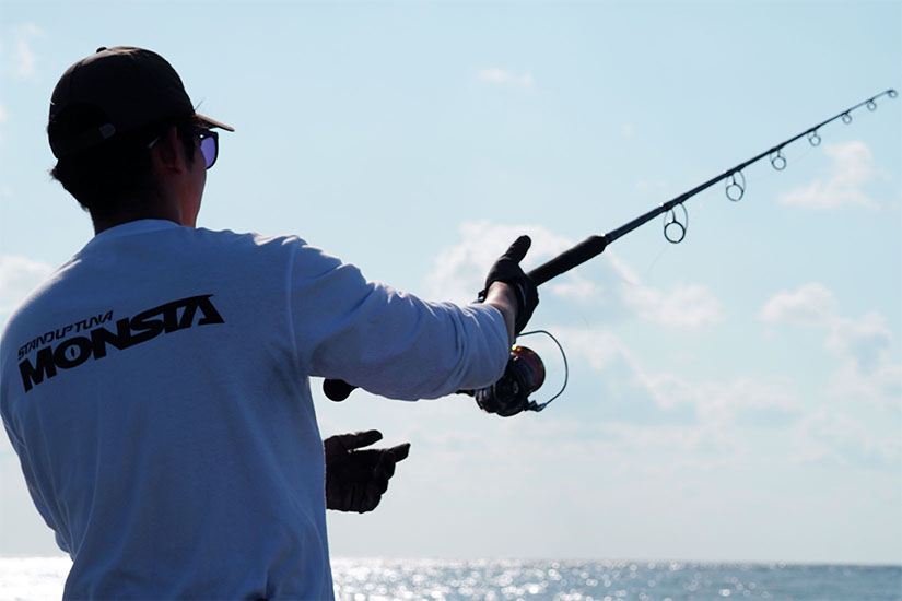 そうです。例えば、キャストする距離を魚から60Mだとして、そこにアジャストするように船の速度が落ちていきます。魚とまだ距離があるうちから、鳥の動き方や魚の水飛沫の大きさから、どんなベイトをどれぐらいのスピードで捕食しているかを判断し、それに合ったタックルを選択します。そして投げる場所を直前までに見定め、一発で決める、というイメージですね。船が近づくと、マグロが水面下でギラッと光ったり、水中にかすかに黒く見えたりもしてきますので、相手の動きを知ることがかなり重要になってきます。これもまた偏光グラスの性能によって大きく差が出るところですね。