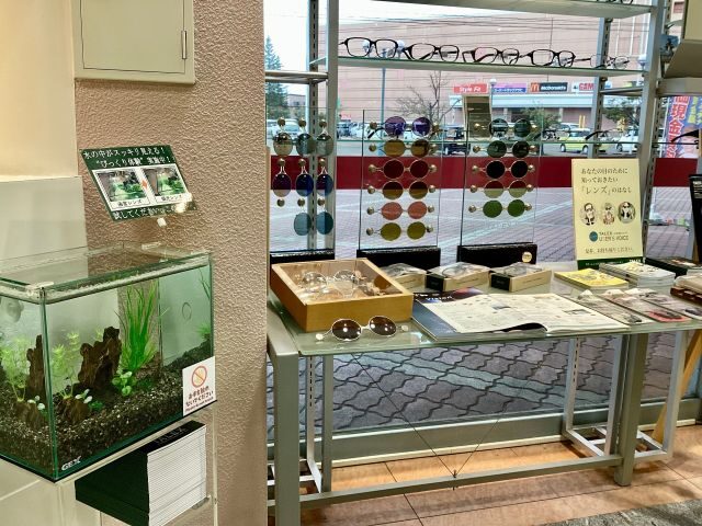 店頭の体験コーナーでは窓から見える様々な季節や時間帯の風景をそれぞれのタレックスのカラーでお試しいただけます。フィッシングをされる方には水槽がございますので水面の光の反射の消え方や水槽の底の起伏のコントラストをカラーごとにお試しいただけます。